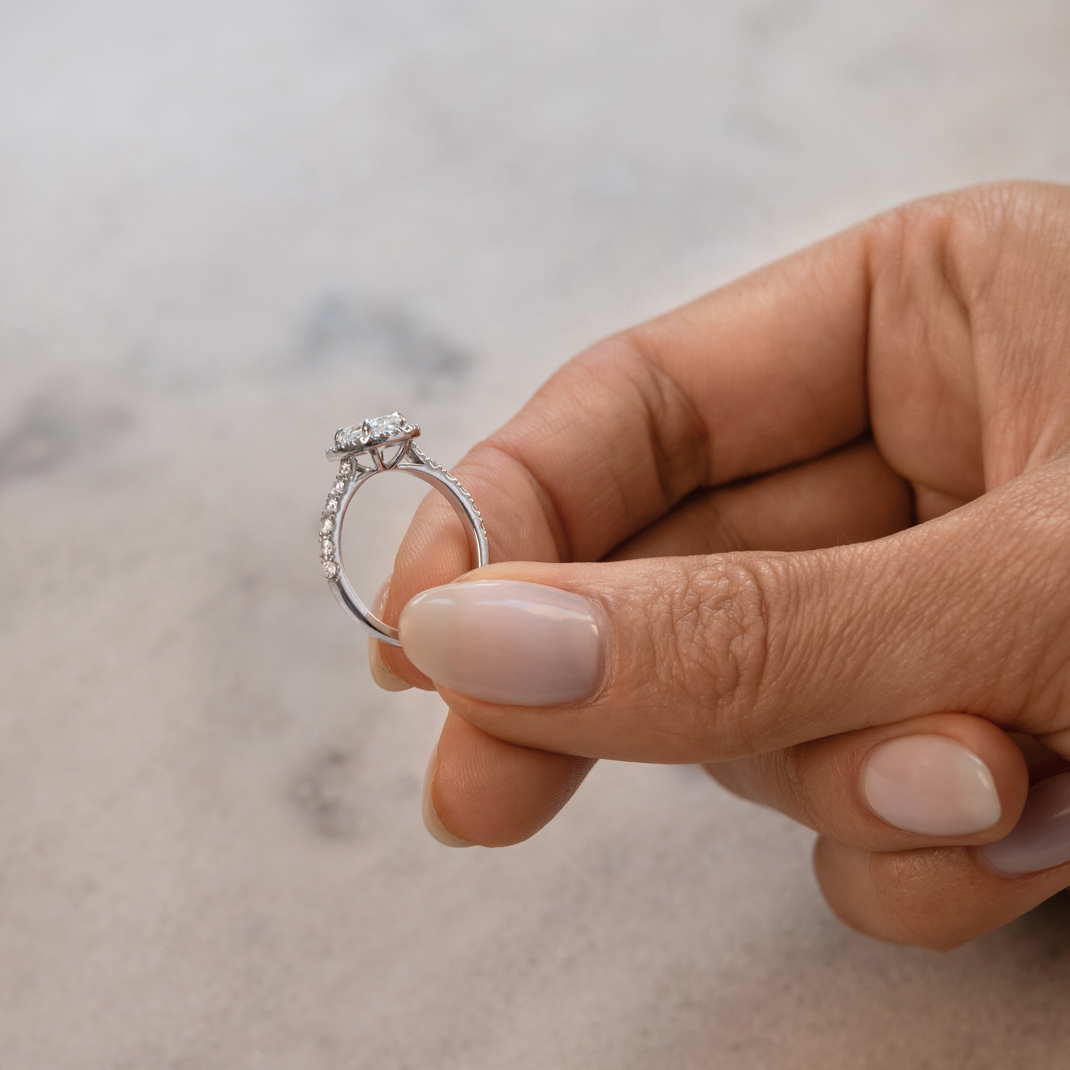 - Center stone: elongated cushion cut diamond of 1.02 ct