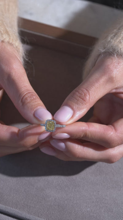 Pictured with a cushion cut fancy yellow diamond of 1.50 ct
